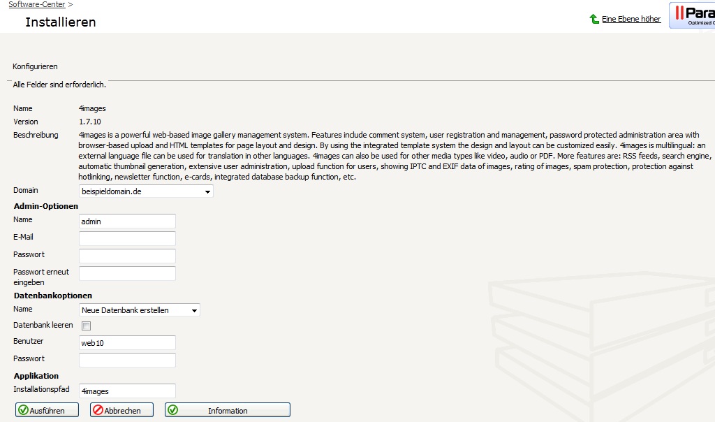 Um das gewünschte Skript installieren zu lassen, klicken Sie einfach auf "Installieren".Domain und Installationsverzeichnis werden bereits vorgegeben (selbstverständlich können Sie diese beliebig ändern). Je nach Paket müssen Sie eventuell noch ein Admin- bzw. Datenbankpasswort angeben: Sollte das ausgewählte Paket eine MySQL Datenbank benötigen, so wird diese automatisch mit angelegt
