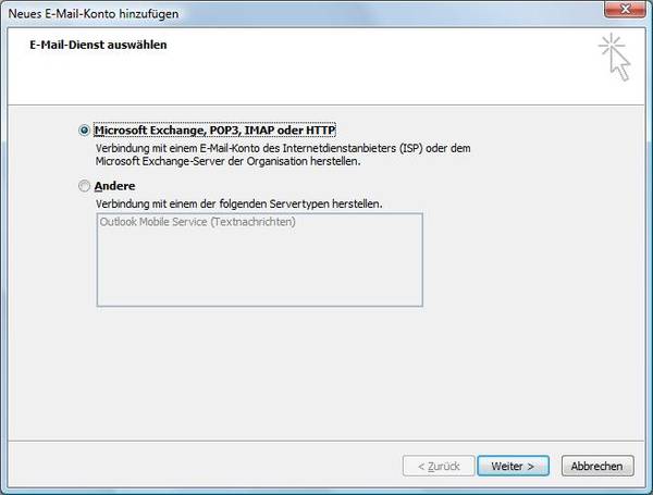 Wählen Sie als E-Maildienst "Microsoft Exchange, POP3, IMAP oder HTTP" aus.