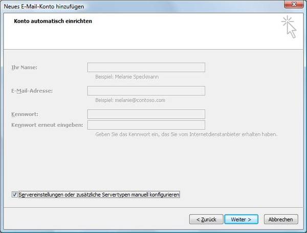 Richten Sie das Postfach bitte manuell ein. Aktivieren Sie dazu bitte das entsprechende Kontrollkästchen.
