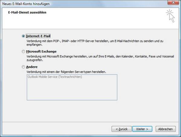 Als E-Maildienst wählen Sie bitte "Internet-E-Mail" aus.